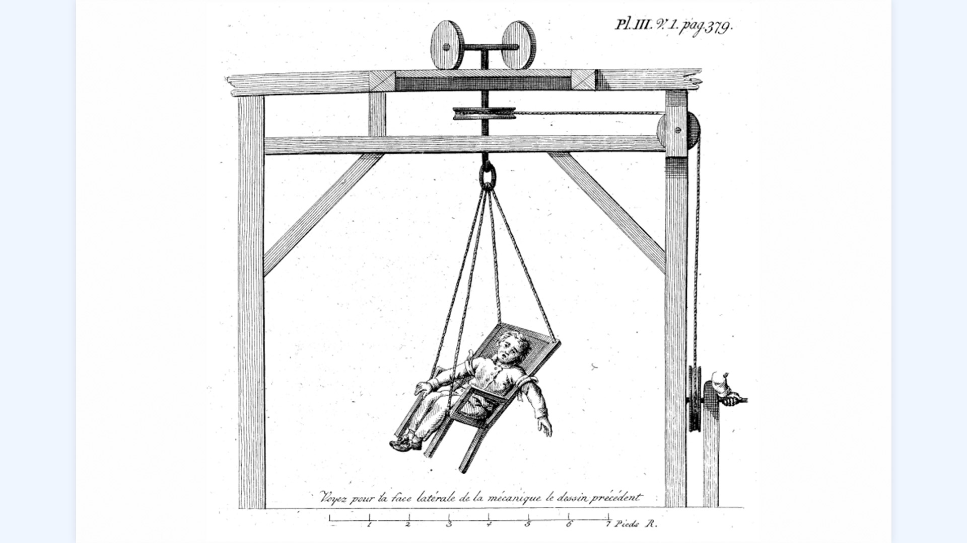 Человека сажали на специальный стул, подвешивали на верёвке и крутили. После нескольких оборотов он якобы успокаивался. Часто больного крутили так долго, что у него начинались головокружение, рвота и неконтролируемое мочеиспускание. Многие действительно успокаивались, потому что были дезориентированы и физически истощены. После процедуры они не могли стоять и говорить.