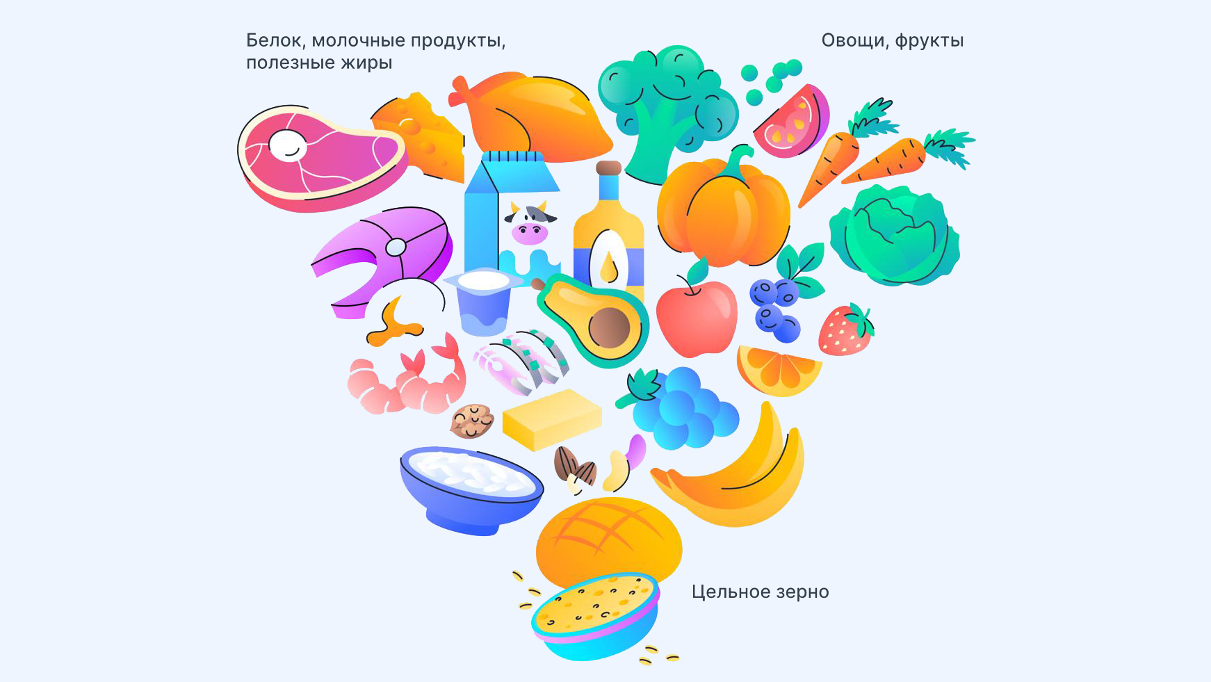 - Обновлен визуальный формат — перевёрнутая пирамида. В рекомендации вернулась пирамидальная структура, однако она изменилась по сравнению с классической моделью. Основу рациона (широкую часть) теперь составляют белки (мясо, яйца, рыба), цельные продукты и полезные жиры. В то же время цельнозерновые продукты переместились в более узкую часть, перестав быть фундаментом питания.
