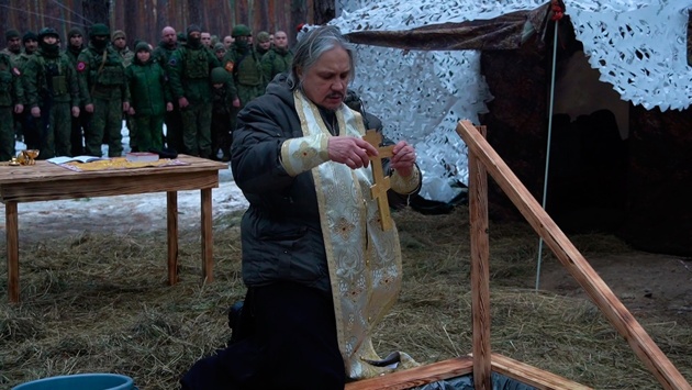 Старший священник группировки отец Николай освятил купель, после чего участники боевых действий совершили обряд окунания. Кадры церемонии публикует Министерство обороны РФ.