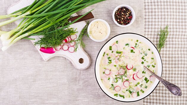 «Надо, чтобы у человека был обед. В норме он должен быть больше по объему, чем ужин. Можно есть прохладные супы типа гаспачо, смузи, огурцы с йогуртом. Окрошка – не вариант для регулярного потребления. Классический вариант содержит квас, а он все-таки сладкий. В этом плане окрошка на обезжиренном кефире больше подойдет», — отметила диетолог.