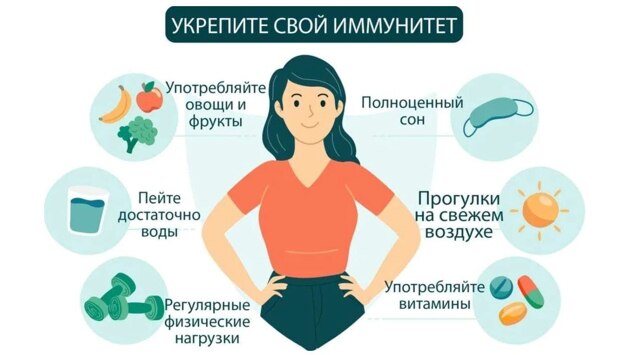 Иммунитет заложен в человеке с рождения. Эффективность иммунной системы зависит от наследственности, однако правильное питание и здоровый образ жизни могут значительно повысить ее активность. Иммунная система – это система особых клеток и белков, защищающих организм от болезнетворных микроорганизмов (например, бактерий, вирусов, грибков). Различают врожденный иммунитет и приобретенный (активный, пассивный). Иммунитет начинает формироваться еще до рождения человека – в материнской утробе. Пассивный иммунитет формируется в организме после введения вакцины. Что необходимо для поддержания иммунитета? 1. Полноценное здоровое питание. Неправильное питание снижает иммунитет. Иммунная защита организма напрямую зависит от того, что мы едим. Белковая пища обеспечивает организм необходимыми аминокислотами для образования антител и других агентов иммунитета. Жиры нужны для построения иммунных клеток, а углеводы дают энергию для функционирования иммунной системы. 2. Отказ от курения и употребления алкоголя. Курение снижает производство антител, необходимых для защиты от патогенных микроорганизмов. Макрофаги становятся менее активными, да еще и выделяют вредные вещества, разрушающие ткани легких. Нарушатся синтез иммуноглобулинов - белков, принимающих активное участие в формировании иммунитета. Алкоголь блокирует производство сигнальных молекул, которые выполняют крайне важные функции в иммунной системе человека, активируя её. 3. Хорошее психоэмоциональное состояние. Стресс негативно влияет на иммунитет – в стрессовом состоянии вырабатывается гормон кортизол, который подавляет синтез антител и активацию макрофагов. 4. Здоровый сон (не менее 8 часов в сутки в хорошо проветренном помещении). 5. Закаливание (обливания и контрастный душ, посещение бани и сауны). 6. Регулярные занятия спортом, подвижный образ жизни. Больше двигайтесь! В норме интенсивная двигательная активность взрослого человека должна составлять минимум 150 минут в неделю, не менее 30минут в день. 7. Не забывайте о необходимой вакцинации. Вакцинация – это основной способ профилактики многих тяжелых инфекционных заболеваний. Вакцинация искусственным способом стимулирует организм к воспроизведению иммунного ответа. В результате вырабатываются антитела, которые самостоятельно борются с инфекцией, создает активный иммунитет к определенным заболеваниям.