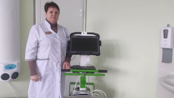Новое оборудование представляет собой передвижную стойку на колесах с встроенным моноблоком. Благодаря небольшим размерам его можно использовать в небольших помещениях, перемещать между кроватями, провозить через узкие дверные проемы.
