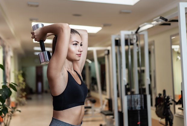 Сядьте на скамью или табурет, держите спину ровно, не сутультесь. Возьмите гантель обеими руками. Поднимите ее над головой, полностью выпрямив руки. Сделайте вдох и согните локти, медленно опуская гантель за голову. Следите, чтобы локти были направлены вперед и почти не двигались. На выдохе выжмите гантель вверх за счет силы трицепсов. Опускайте снаряд плавно, поднимайте только усилием трицепсов. Следите, чтобы траектория была строго вверх-вниз. Сделайте 3–4 подхода по 8–12 повторений.