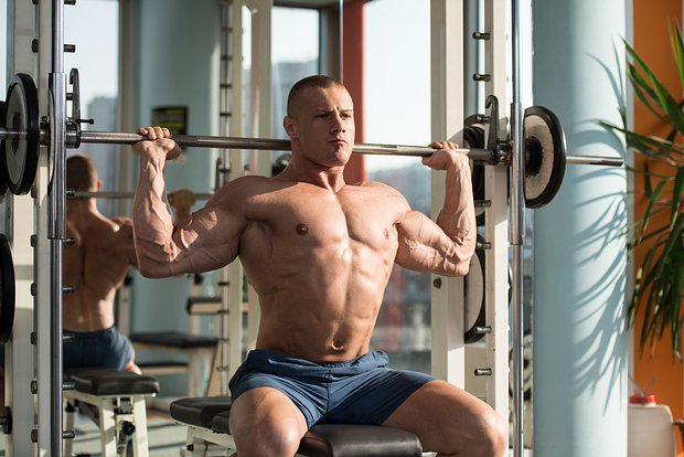 Сидя на устойчивой опоре, возьмите штангу хватом чуть шире плеч. Выжимайте штангу вертикально вверх, локти должны разгибаться. Контролируя движения, медленно опустите штангу к грудной клетке. Сделайте 3−5 подходов по 3−6 повторений.