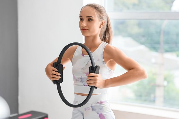 Возьмите изотоническое кольцо и держите его на уровне грудной клетки. Локти направьте в стороны. Плавно сожмите кольцо и, удерживайте в течение нескольких секунд. Сделайте 2 подхода по 10-20 повторений.