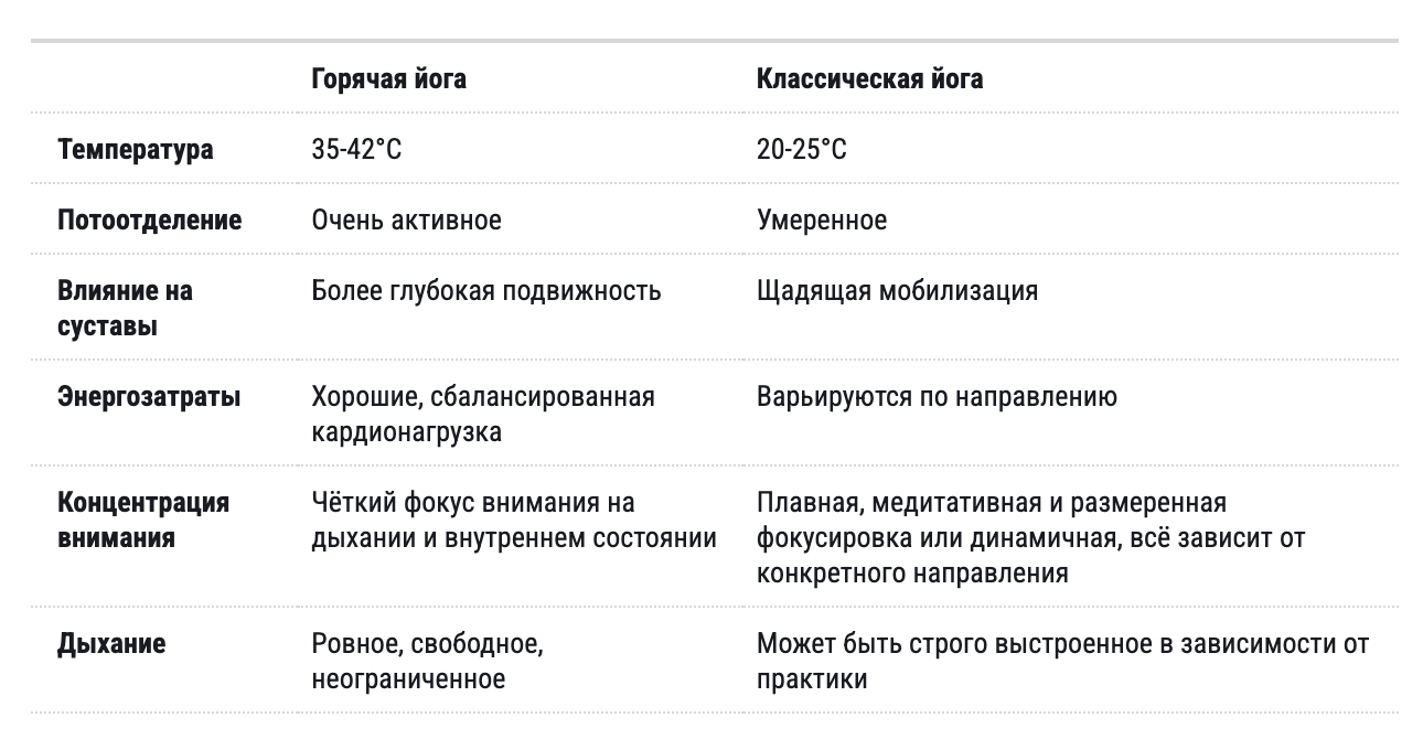 Горячая йога Классическая йога Температура 35-42°C 20-25°C Потоотделение Очень активное Умеренное Влияние на суставы Более глубокая подвижность Щадящая мобилизация Энергозатраты Хорошие, сбалансированная кардионагрузка Варьируются по направлению Концентрация внимания Чёткий фокус внимания на дыхании и внутреннем состоянии Плавная, медитативная и размеренная фокусировка или динамичная, всё зависит от конкретного направления Дыхание Ровное, свободное, неограниченное Может быть строго выстроенное в зависимости от практики