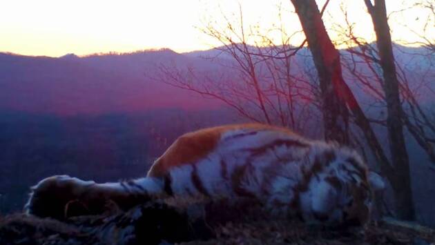На видео показали закатный вечер и как на фоне высоких сопок прилег поспать большой тигр. Он абсолютно без стеснений расположился возле камеры.