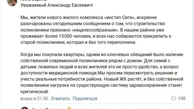 Куряне умоляют губернатора Хинштейна построить таки поликлинику рядом с ЖК «Инстеп Сити» Обращение появилось на странице Александра Хинштейна в ВК: - Мы, жители нового жилого комплекса «Инстеп Сити», искренне разочарованы сегодняшним сообщением о том, что строительство поликлиники признано «нецелесообразным». В нашем районе уже проживает более 15 000 человек, и всех нас собираются прикрепить к старой поликлинике, которая и без того переполнена. Люди говорят, что когда мы покупали квартиры, одним из ключевых обещаний было наличие собственной современной поликлиники рядом с домом: - Для семей с детьми, пожилых людей и всех жителей это не просто удобство, а вопрос доступности медицинской помощи.Мы просим пересмотреть решение и учесть реальные потребности района. Новый ЖК растёт, и без собственной поликлиники нагрузка на существующую систему здравоохранения станет критической. Под обращением оставили комментарии десятки людей, все они хотят новую поликлинику: - Ну как так? О каком демографическом росте может идти речь? Если каждую неделю приходят новости о том, что из долгостроя на Клыкова хотят сделать гостиницу, а детская поликлиника в полуподвальном помещении находится, а сегодня вообще говорят, что запланированую поликлинику строить не будут! Нецелесообразно!!! Просто в голове не укладывается, а очередное коммерческое помещение оказывается целесообразно.
