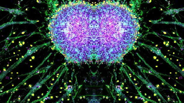 Второе место занял Бобби Бумелхем за снимок «Близко к сердцу», на котором изображены клетки рака молочной железы в культуре. Это изображение, богатое деталями, помогает понять, как раковые клетки реагируют на различные раздражители, что очень важно для развития исследований в области рака.