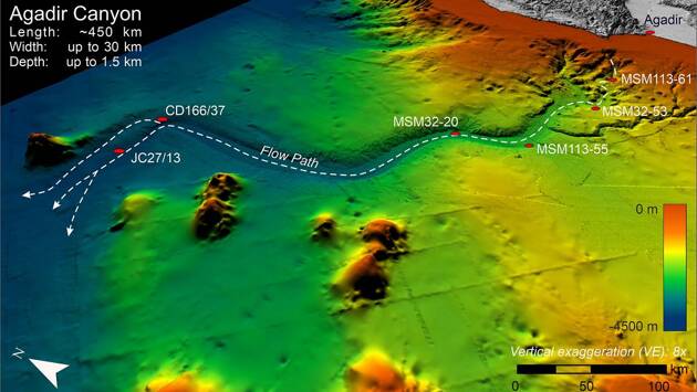 Ученые изучили гигантскую подводную лавину, образовавшуюся около 60 тысяч лет назад в Агадире — одном из крупнейших подводных каньонов. Эта лавина началась как небольшой оползень объемом 1,5 кубических километра, но затем она увеличилась в размерах, увлекая за собой различные материалы, такие как валуны, гравий, песок и грязь.