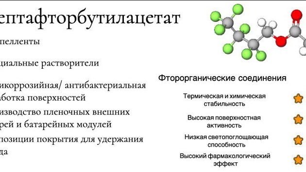 Сам, гептафторбутилацетат входит в состав пропеллентов, антикоррозийных или антибактериальных аэрозолей, растворителей, применяется при производстве пленочных внешних батарей и батарейных модулей (мембран), а также для создания композиции покрытия для удержания заряда и др. Нами рассмотрен процесс получения целевого продукта через этерификацию, т.е. смешивание кислоты со спиртом. В системе отсутствуют побочные продукты, реакция проходит быстро.