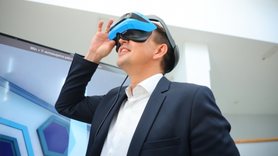 Студент Иван Фоменко впервые посетил выставку и конференцию. Он примерил очки виртуальной реальности, которые в рамках выставки призваны помочь освоить новый навык, например, кулинарный.