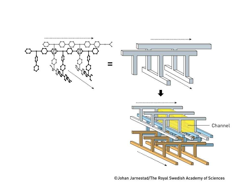 Однако у самурая есть только путь. Он следовал своему дао, не сдался и в 1997 году совершил свой первый крупный прорыв. Используя ионы кобальта, никеля или цинка и молекулу под названием 4,4′-бипиридин, группа Китагавы создала трёхмерные металлоорганические каркасы с открытыми каналами. Когда из синтезированного каркаса удалили воду, он внезапно остался стабилен, а его полости можно было поместить молекулы различных газов. Материал мог поглощать и выделять метан, азот и кислород, не меняя структуры и не разрушаясь.