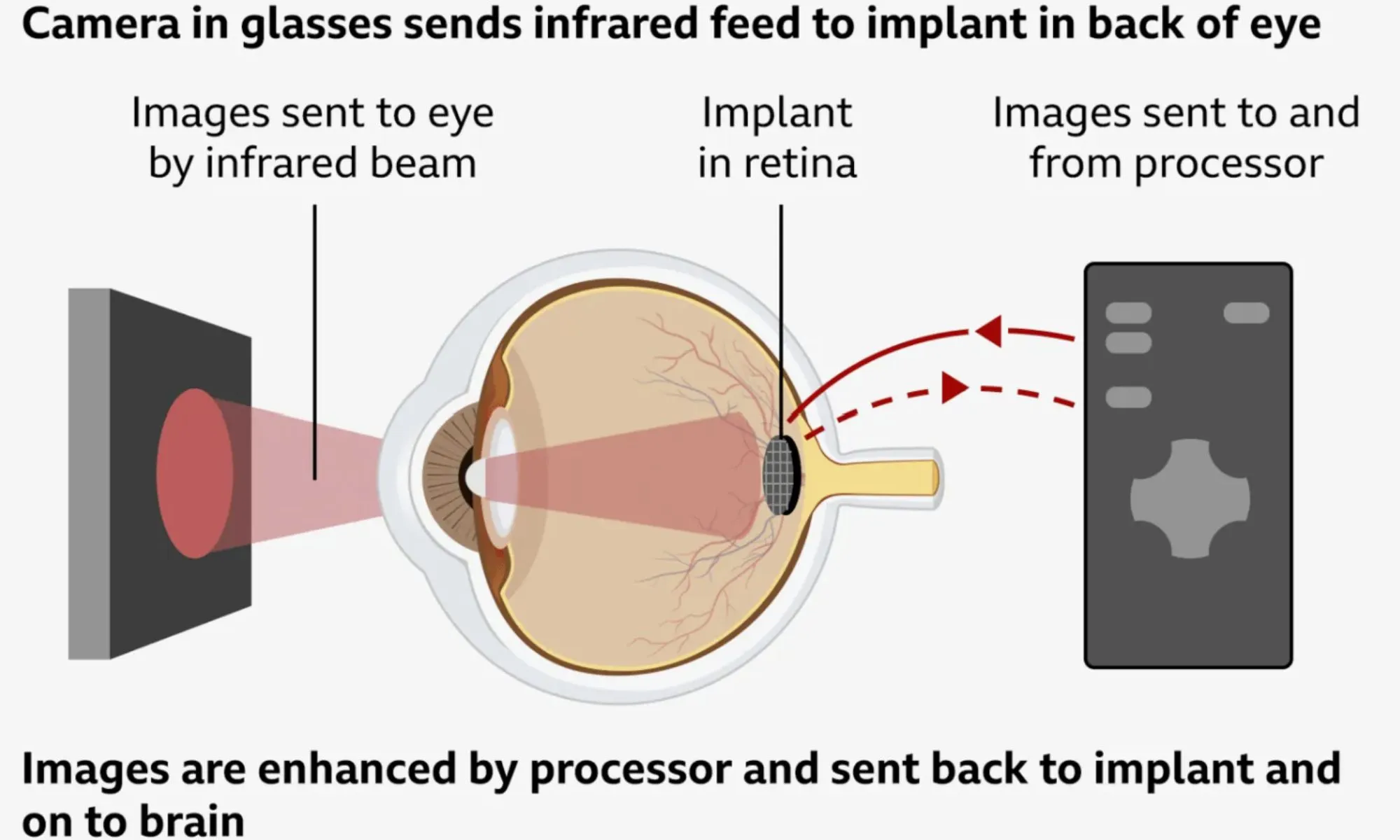 Чип толщиной меньше человеческого волоса хирург помещает под сетчатку глаза. Пациент носит специальные очки дополненной реальности с камерой. Камера фиксирует окружающее, передаёт сигнал на чип с помощью инфракрасного света, а мини-компьютер переводит его в электрические импульсы, которые мозг воспринимает как изображение.