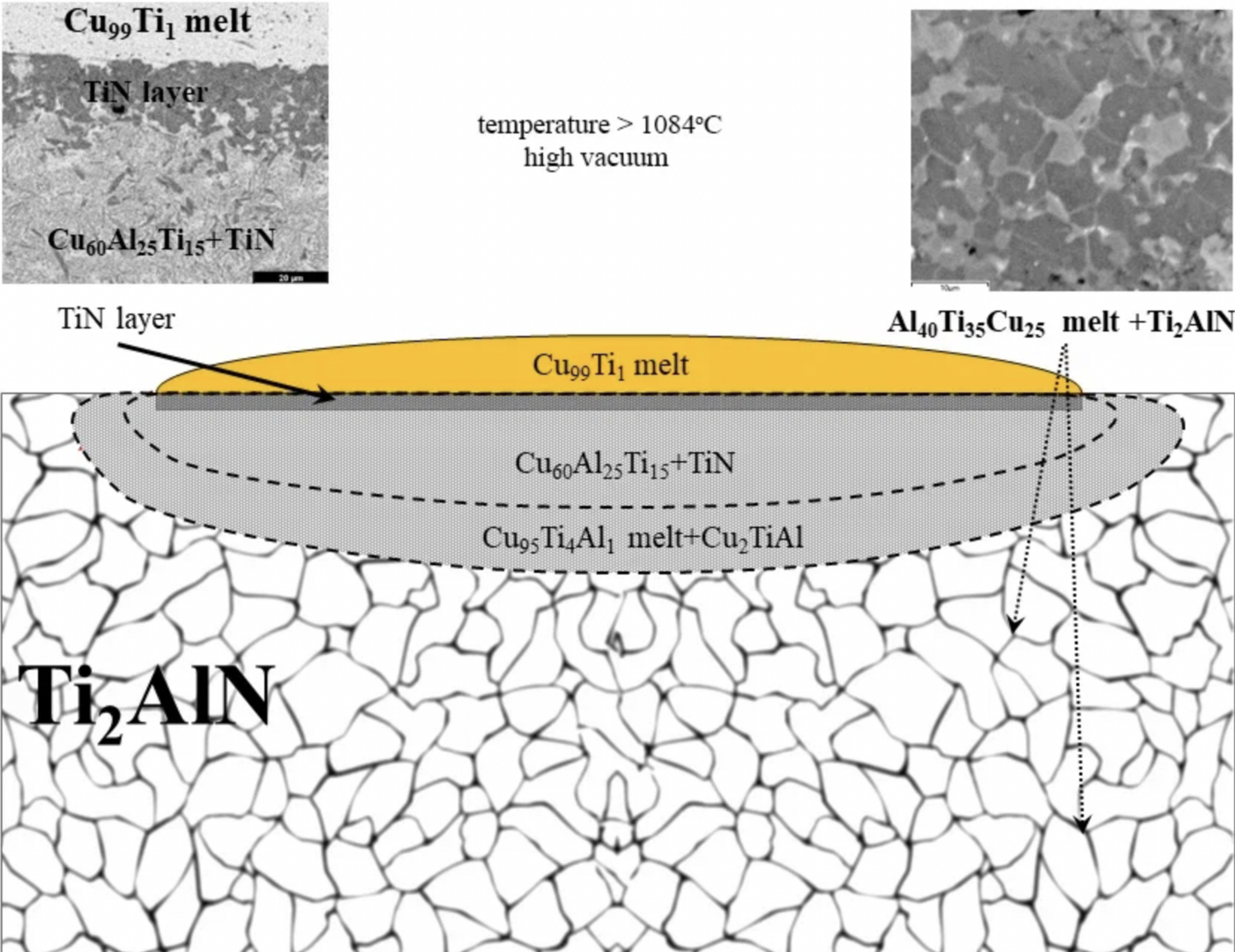 Оказалось, что при контакте с медью стабильная структура макс-фазы начинает разлагаться на твердые частицы нитрида титана, а также атомы алюминия, которые переходят в медный расплав. Это приводит к тому, что объем макс-фазы уменьшается, из-за чего в ней формируются микрополости. Медный расплав активно заполняет их, впитываясь в материал. При этом авторы измеряли скорость поглощения меди и ее зависимость от температуры. Оказалось, что процесс распада и впитывания происходит контролируемо: его можно регулировать с помощью температуры и времени нагрева выше температуры плавления меди.