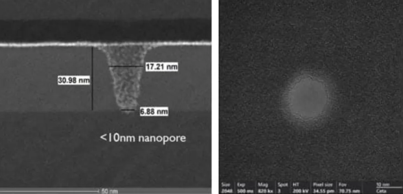 Нанопоры представляют собой отверстия диаметром всего несколько нанометров. В демонстрационном проекте IMEC были получены равномерные структуры размером около 10 нм на пластинах диаметром 300 мм. Такие размеры примерно в 10 000 раз меньше толщины человеческого волоса.