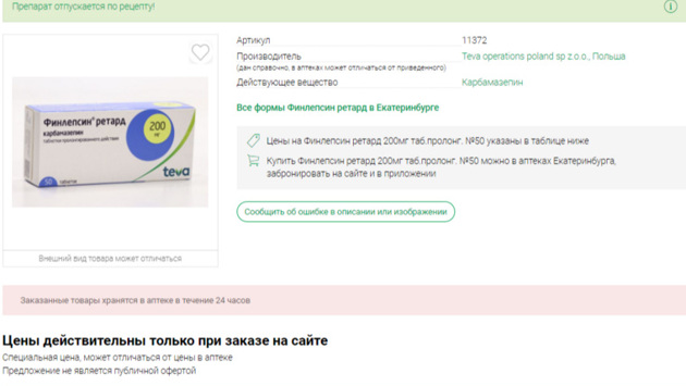 Журналист URA.RU просмотрела некоторые интернет-аптеки и не обнаружила польского лекарства «Финлепсин-ретард» в наличии. Препарата нет в агрегаторе ЕАПТЕКА, а также в крупных аптечных сетях уральской столицы — «Живика» и «Фармленд».