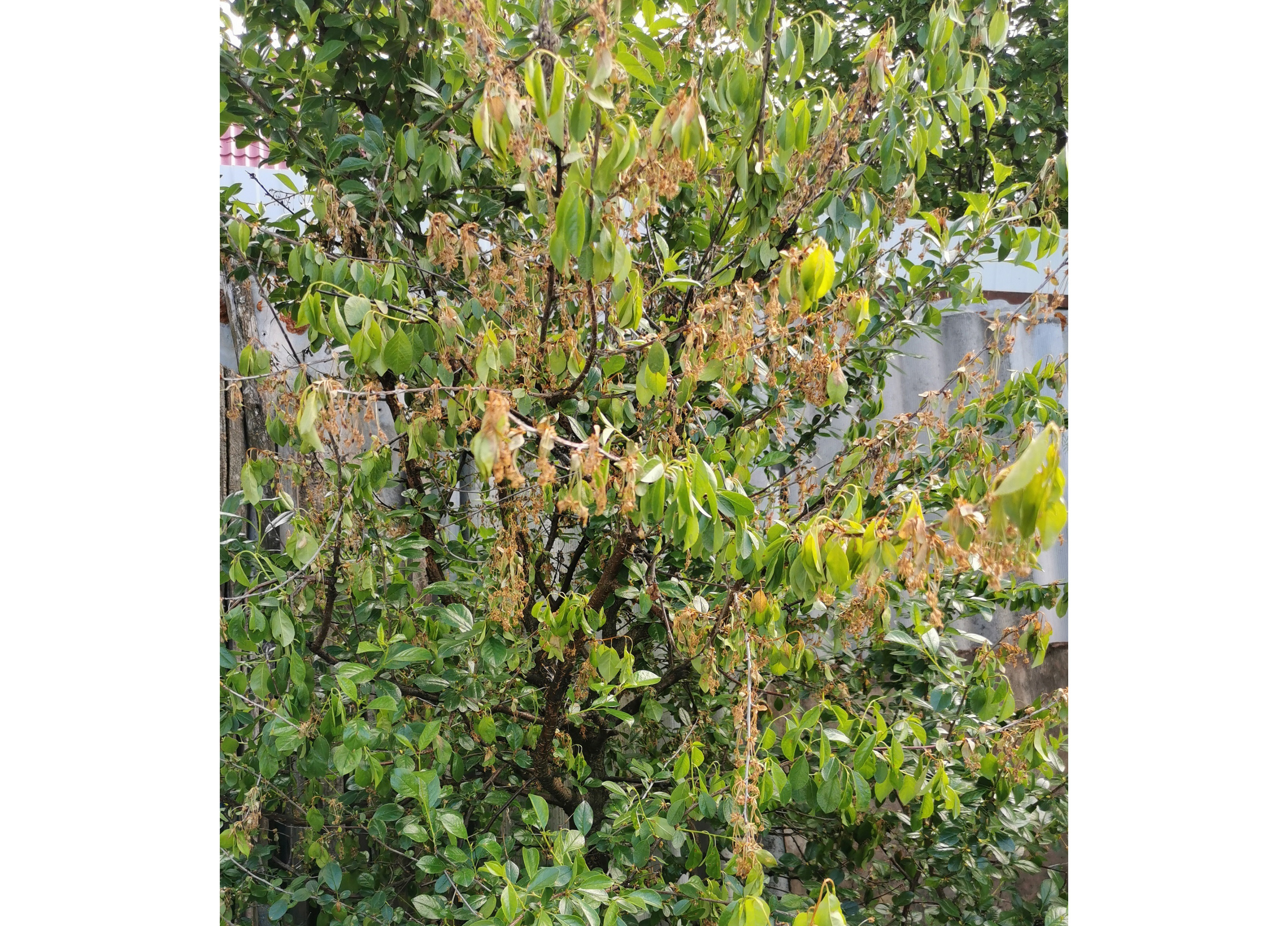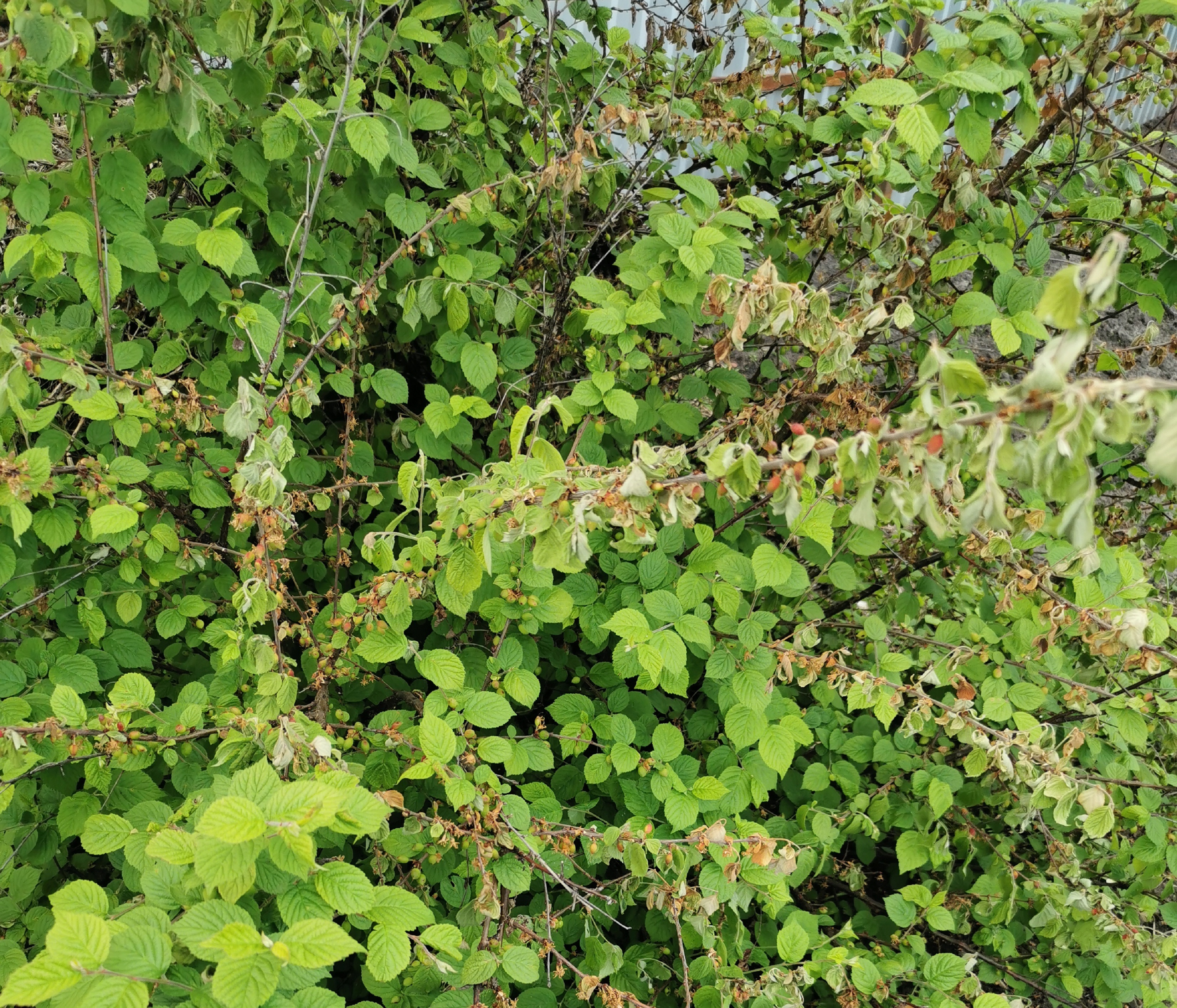 Войлочная вишня болеет всегда, и неоднократно возникало желание от неё избавиться. Но каждый раз оставляли, максимально обрезали и уничтожали поврежденные ветки. К сожалению, нет фотографий прошлых сезонов, но выглядела вишня в разы хуже. Этой весной, помимо болезней, косточковые пострадали ещё и от заморозков.